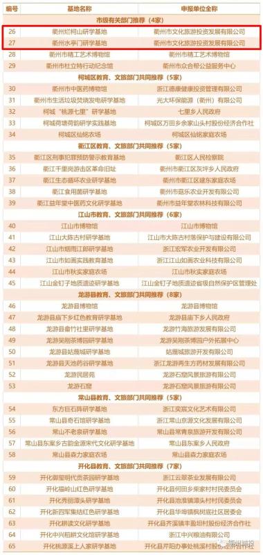衢州中小學生研學實踐教育基地名單