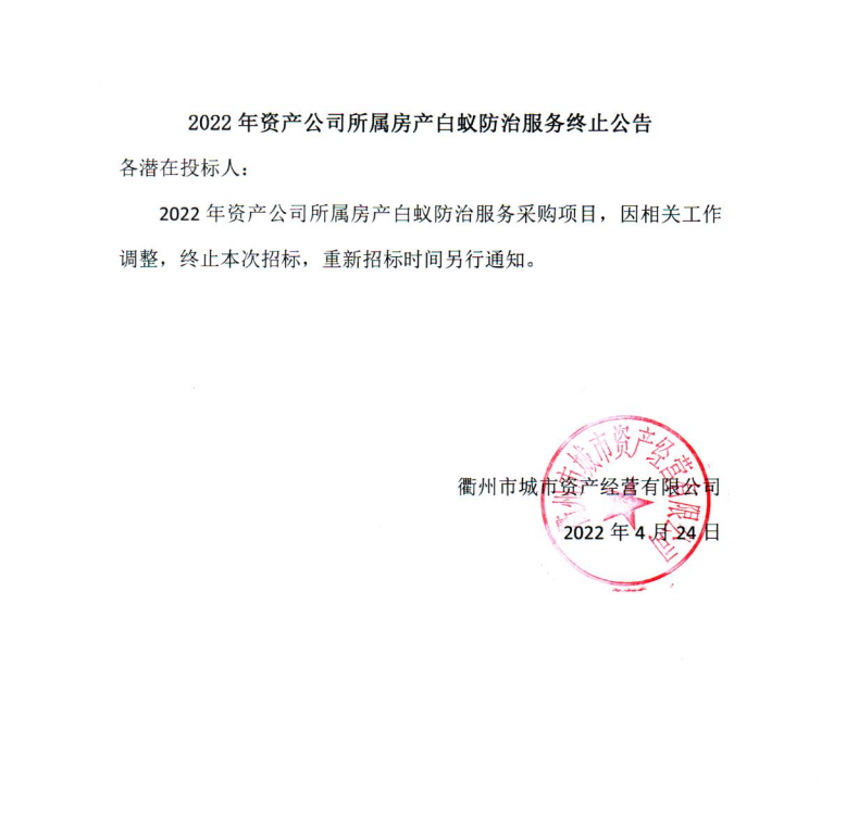 2022年資產(chǎn)公司所屬房產(chǎn)白蟻防治服務(wù)終止公告