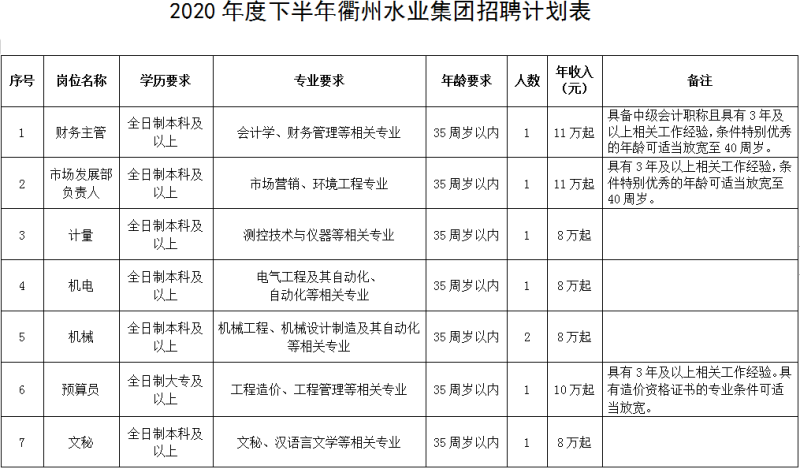 1.2020年度下半年衢州水業(yè)集團(tuán)招聘計(jì)劃表
