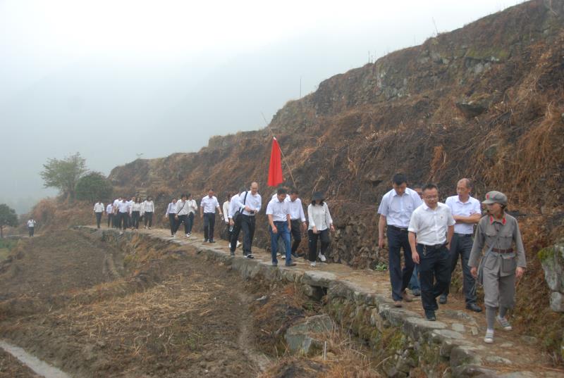 黨員干部們懷著無比崇敬的心情參觀了傅春齡故居,并在故居內(nèi)的巨幅黨旗前莊嚴(yán)宣誓。隨后,大家一起重走了全程2.5公里的紅軍路,紅軍路由大小石塊壘砌成臺階,蜿蜒在山田間,這條路曾是通往遂昌、福建、江西等地的咽喉要道,粟裕將軍率領(lǐng)的挺進師就曾經(jīng)走過這里。在沿途,還能見到紅軍墻和紅軍石,紅軍石是一塊巨大的紅砂巖,底下有個非常隱蔽的洞穴,當(dāng)年老百姓和紅軍常通過這個洞穴傳遞情報和糧食。