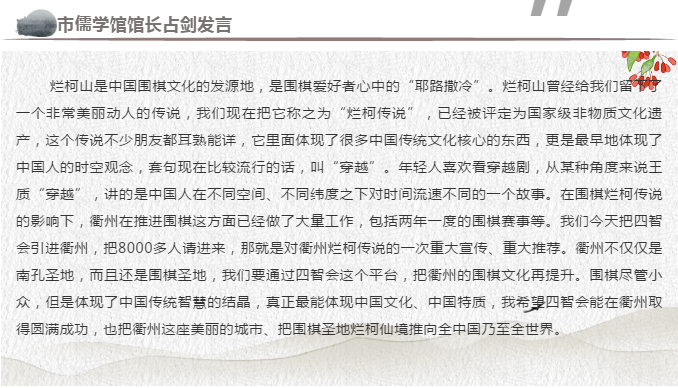 爛柯仙境、衢州有禮。在第四屆全國智力運(yùn)動會倒計時10天之際,四智會開幕式新聞發(fā)布會在爛柯山景區(qū)舉行,10余家省市主流媒體前來助陣,向世界傳播爛柯山圍棋圣地的獨特魅力。市政府副秘書長吳劍波、市體育局局長汪暉、衢州中國儒學(xué)館館長占劍和四智會開幕式總導(dǎo)演羅可歌參加。