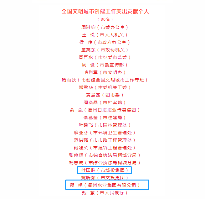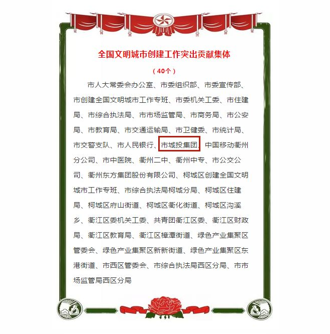 其中,市城投集團(tuán)獲全國文明城市創(chuàng)建工作突出貢獻(xiàn)集體,葉國勝、繆明獲全國文明城市創(chuàng)建工作突出貢獻(xiàn)個人。